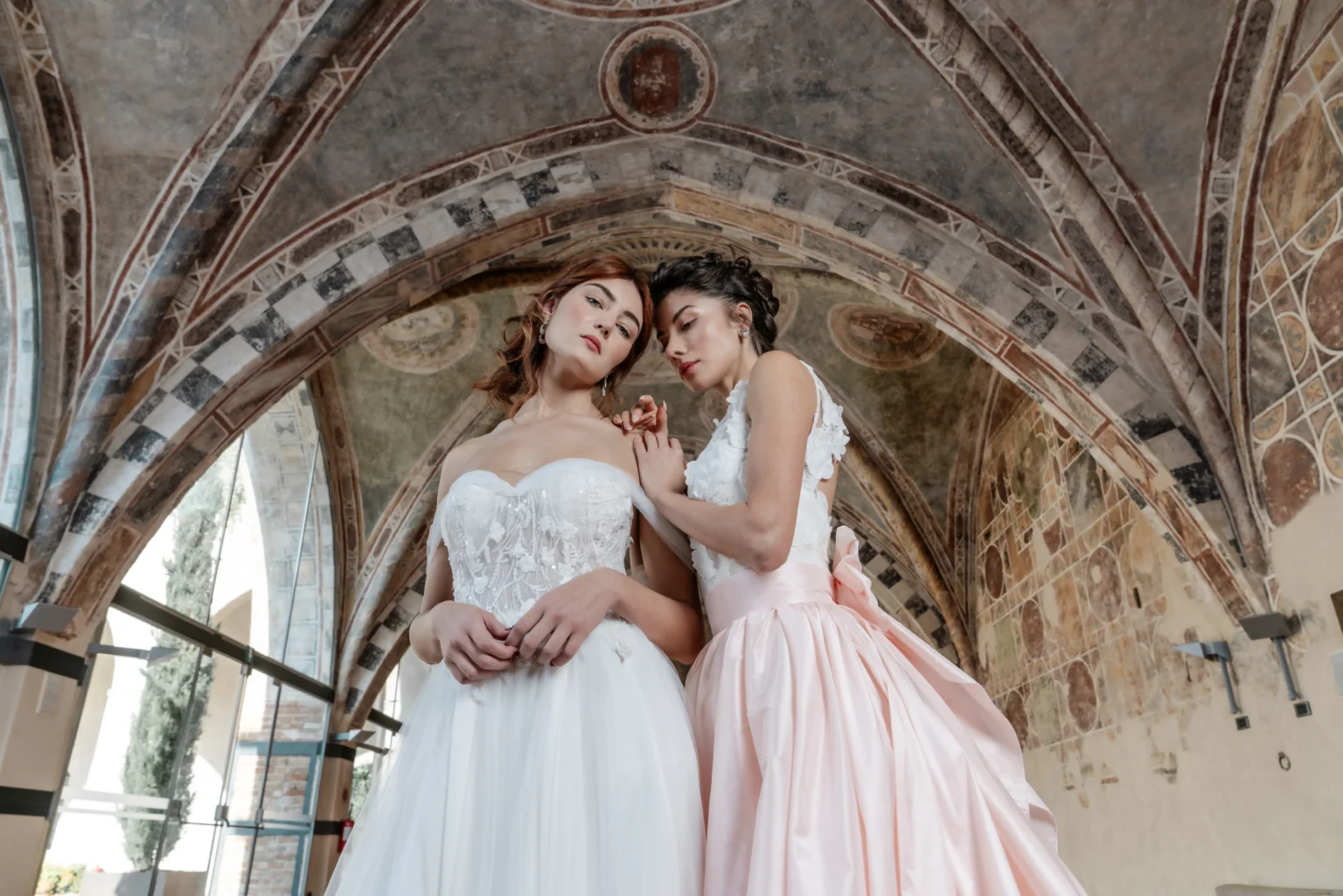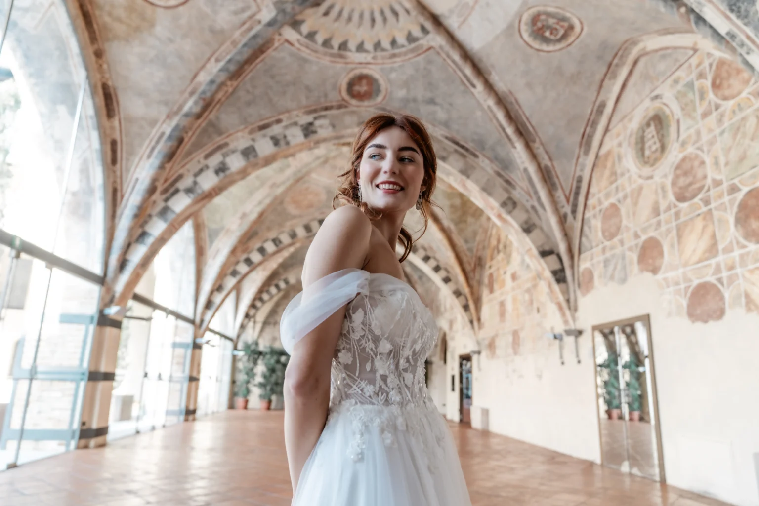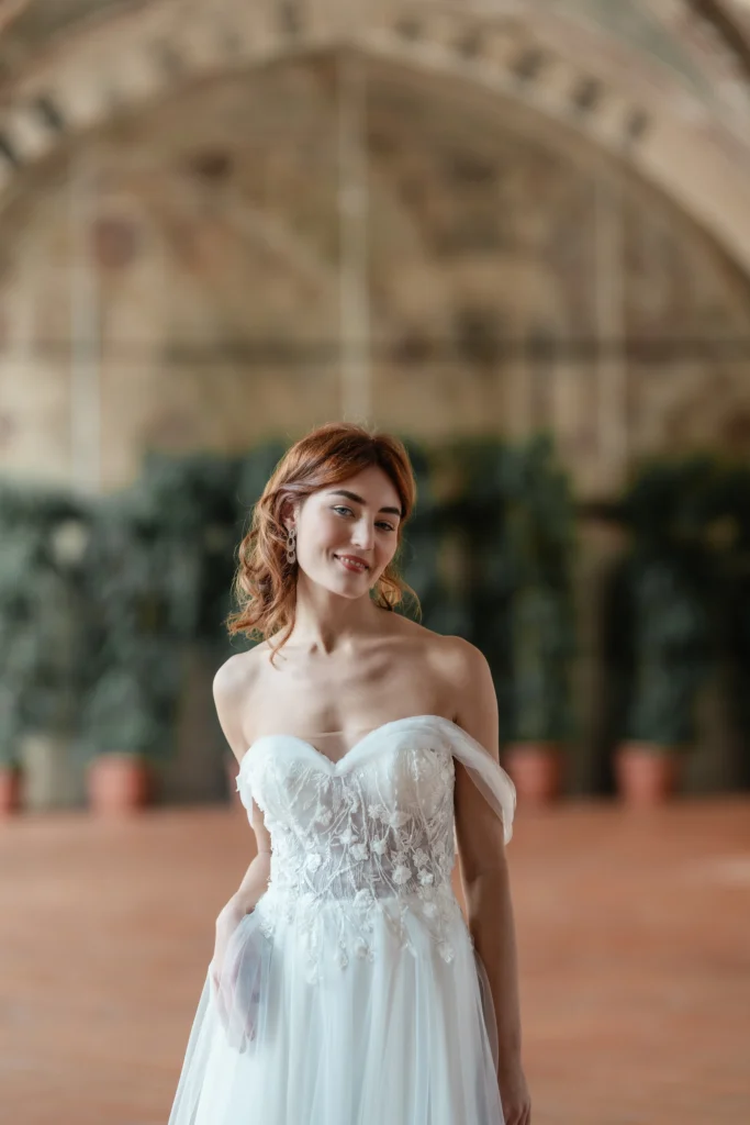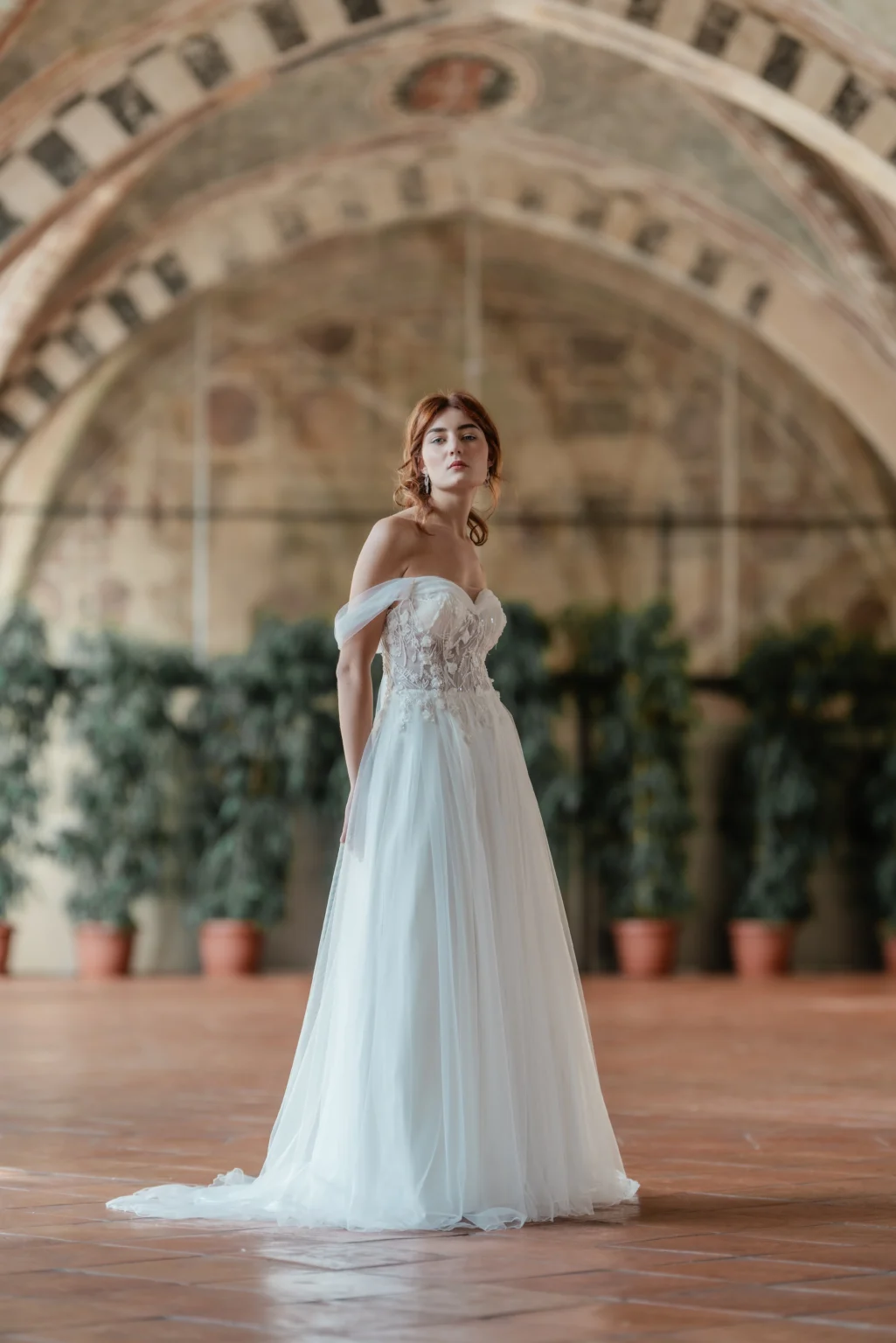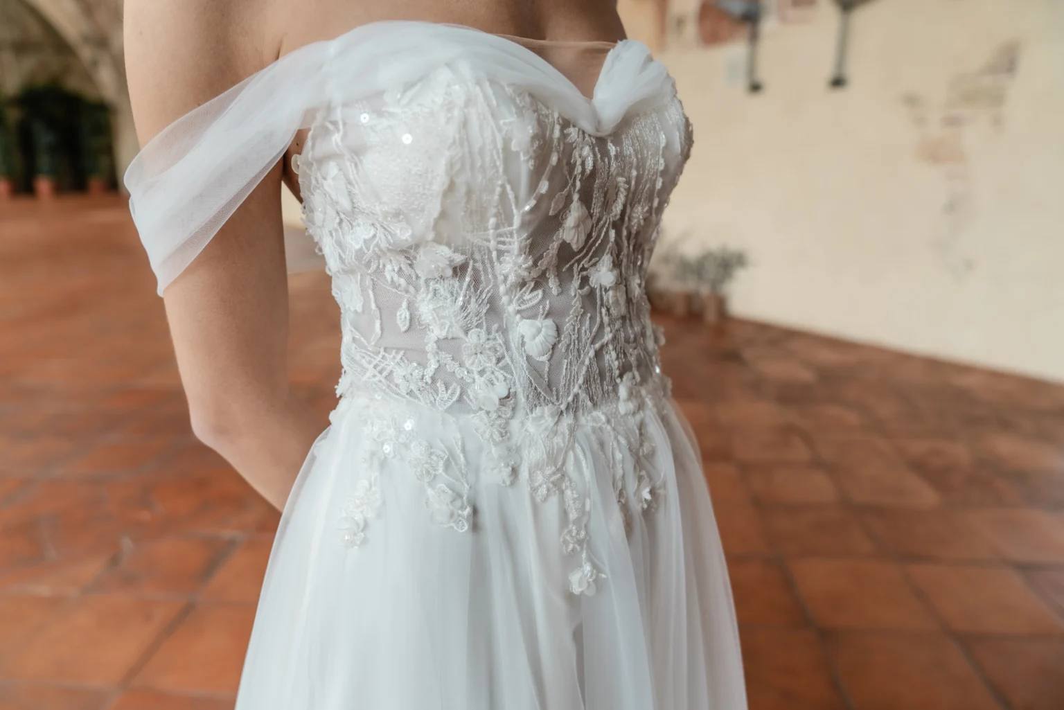 Abito da sposa scivolato con gonna in tulle morbida e corpino trasparente ricamato con fiori in rilievo. Ramage di pizzo sulla gonna e manicotte in tulle con nodo posteriore. Per spose che cercano leggerezza e dettaglio.